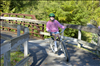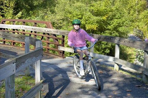 Volunteers lead small groups of students on a fall bike ride. One image is of students walking their bikes down the driveway of Stanford Hostel in Peninsula. The others are taken along the Towpath Trail at Boston Store Visitor Center (white building) and at Lock 29 (inside lock and on bridge) in Peninsula, OH. || Cycling Schools is a volunteer group of Cuyahoga Valley National Park. They lead free bicycling programs for Cleveland schools in spring and fall. The program begins at Stanford Hostel and features a ride along the Towpath Trail.