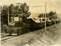 Railway: electric train of skip (hoist) cars conveying limestone to the grinding rolls. Edison Portland Cement Company written on side of train.