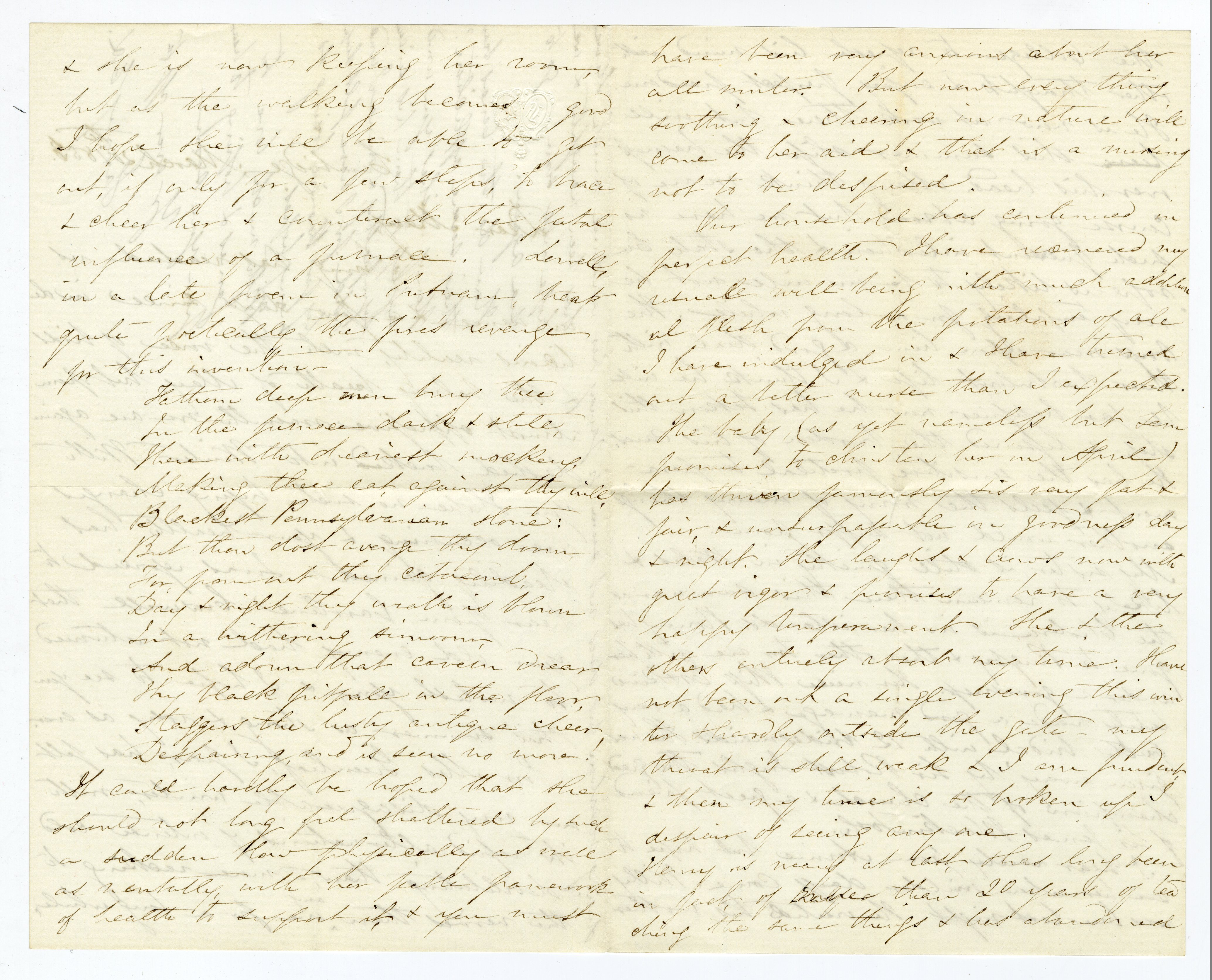 Our household has continued in perfect health. I have recovered my usual well-being with much additional flesh from the potabions of ale I have indulged in & I have turned out a better nurse than I expected. The baby, (as yet nameless but Sam promises to christen her in April) has thriven famously & is very fat & fair, & unsurpassable in goodness day & night. She laughs & crows now with great vigor & promises to have a very happy temperament. She & the others entirely absorb my time. I have not been out a single evening this winter & hardly outside the gate – my throat is still weak & I am prudent, & then my time is so broken up I despair of seeing any one.