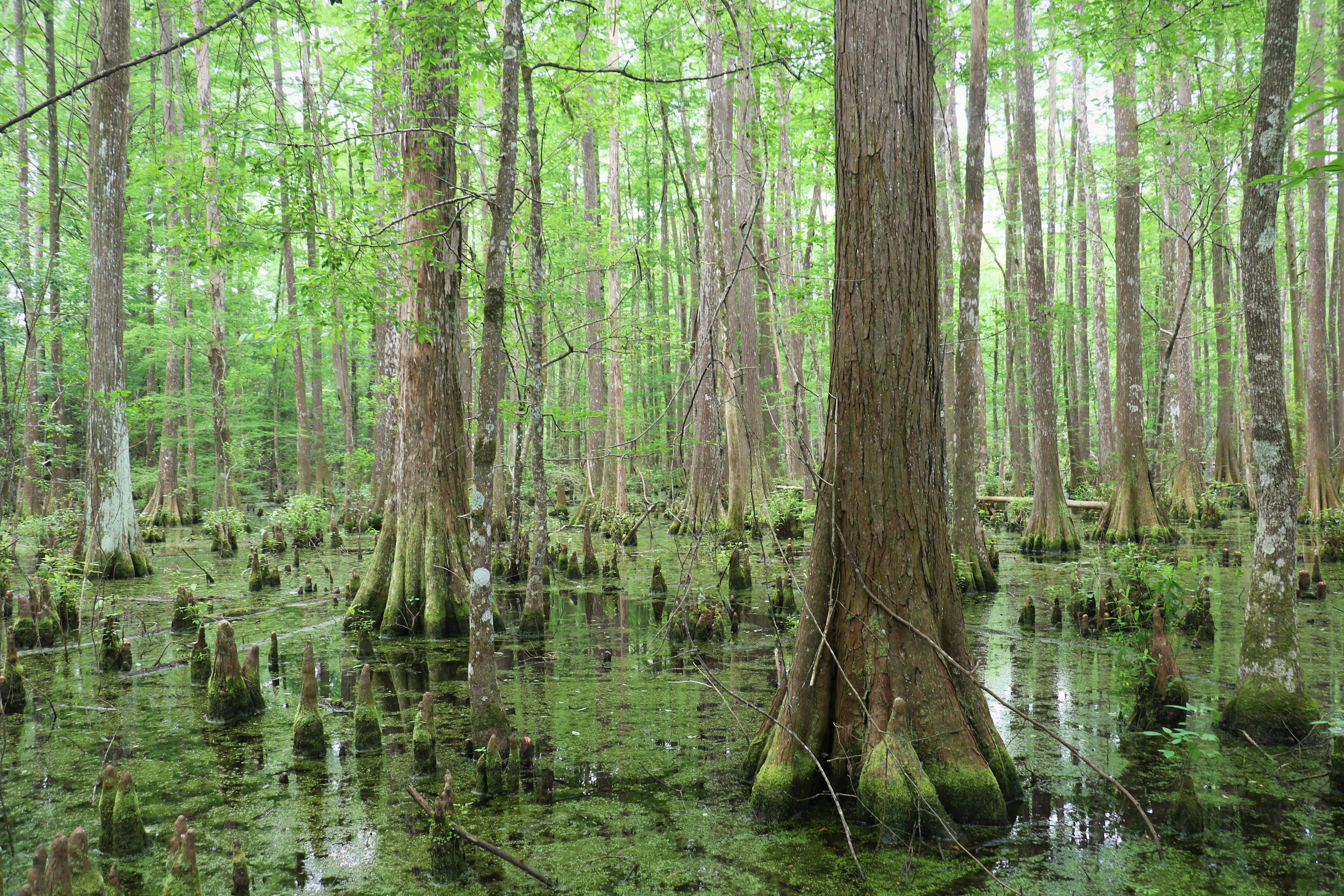 Intense greenery in a bald cypress swamp with green, murky water, and a leafy canopy.