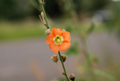 A close-up image of a Globemallow flower, showing its delicate, pale orange petals. The soft, velvety texture of the petals contrasts with the intricate details of the flower's reproductive structures, capturing the beauty and simplicity of the bloom.