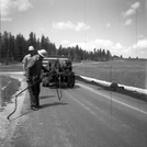BW Photos of road repairs at Cedar Breaks. Man standing by equipment. ; ZION Museum and Archives Image 905_04_05005 ; ZION 15933