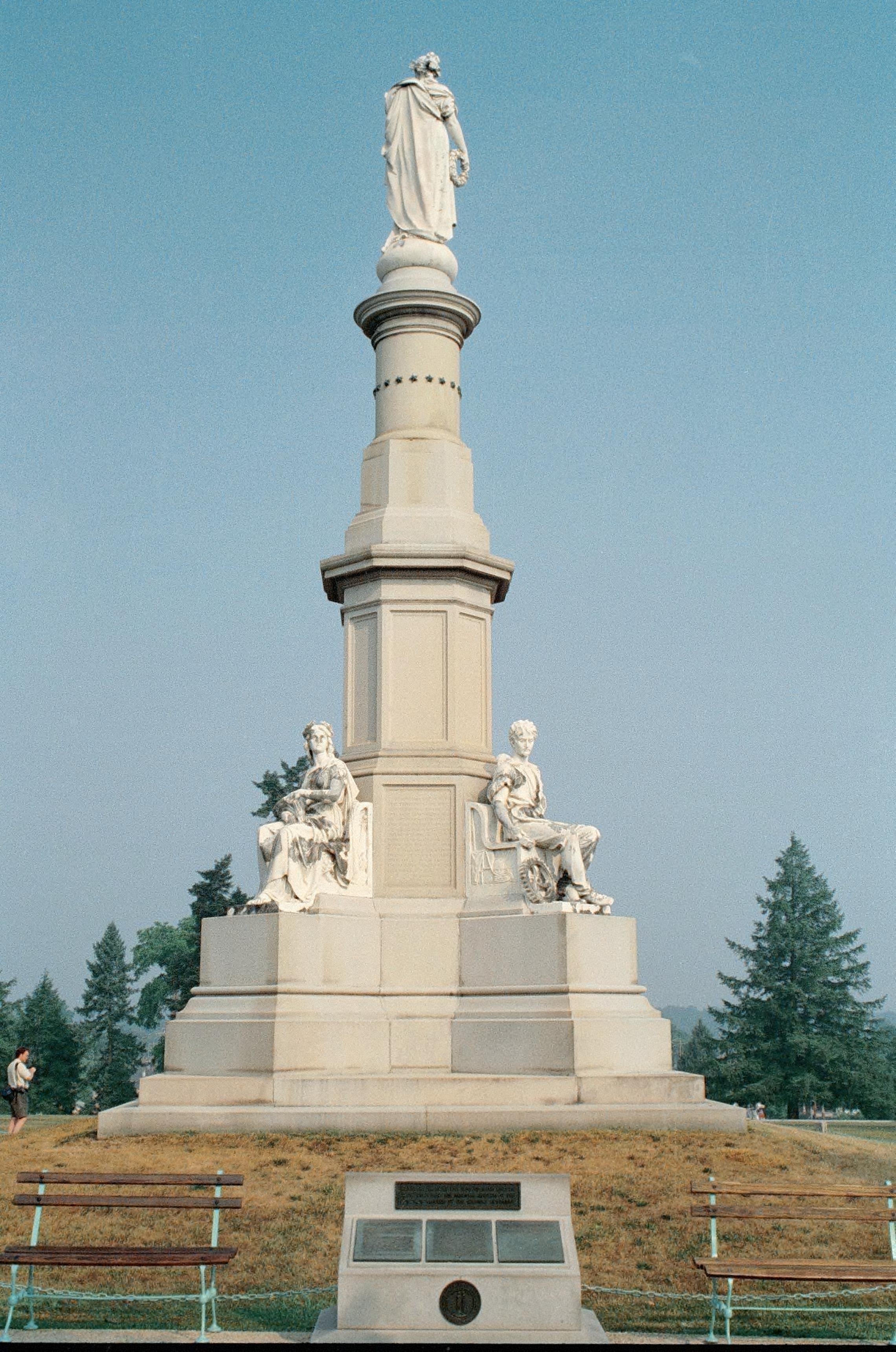 First monument erected at Gettysburg to honor all soldiers at Gettysburg. Sits on site of speaker's platform where Gettysburg Address was orated. Sculpted by Randoph Rogers.