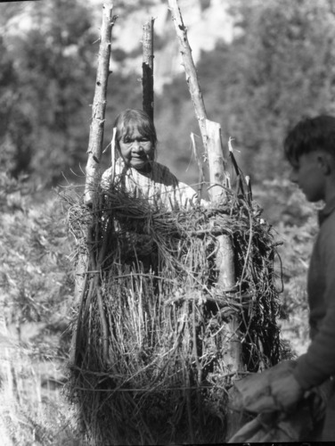 Ta-buce- (Maggie Howard) filling Chucka with acorns. Note: She stands inside to line chucka and place the acorns. Chucka is thatched later.
