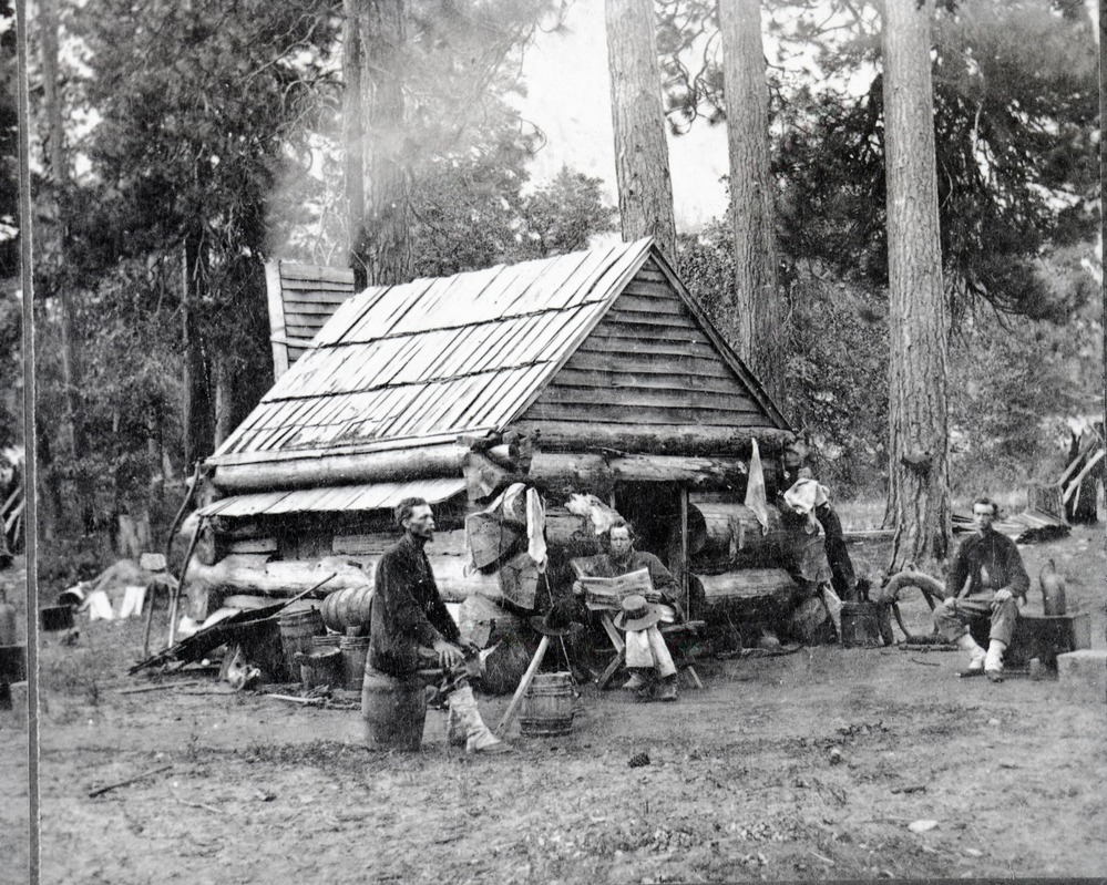 Copy Neg: Michael Dixon, July 24, 1985. Detail of L. Smaus stereo card (RL-16,441). Caption: "The First House int he Yosemite Valley, Cal." Lamon cabin.