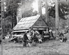 Copy Neg: Mike Floyd, 1992. Site of Lamon's cabin at the Y. P. & C. Co. stables. Two men in the middle are Chris Brown (Chief Lemee) and Ranger Bert Harwell.