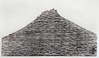 A black-and-white image made with ink printed on paper. This image shows the "Checkerboard Mesa" at Zion National Park, which is a large sandstone peak. The checkerboard texture is created by cracks in the stone, which run horizontally and vertically, forming squares.