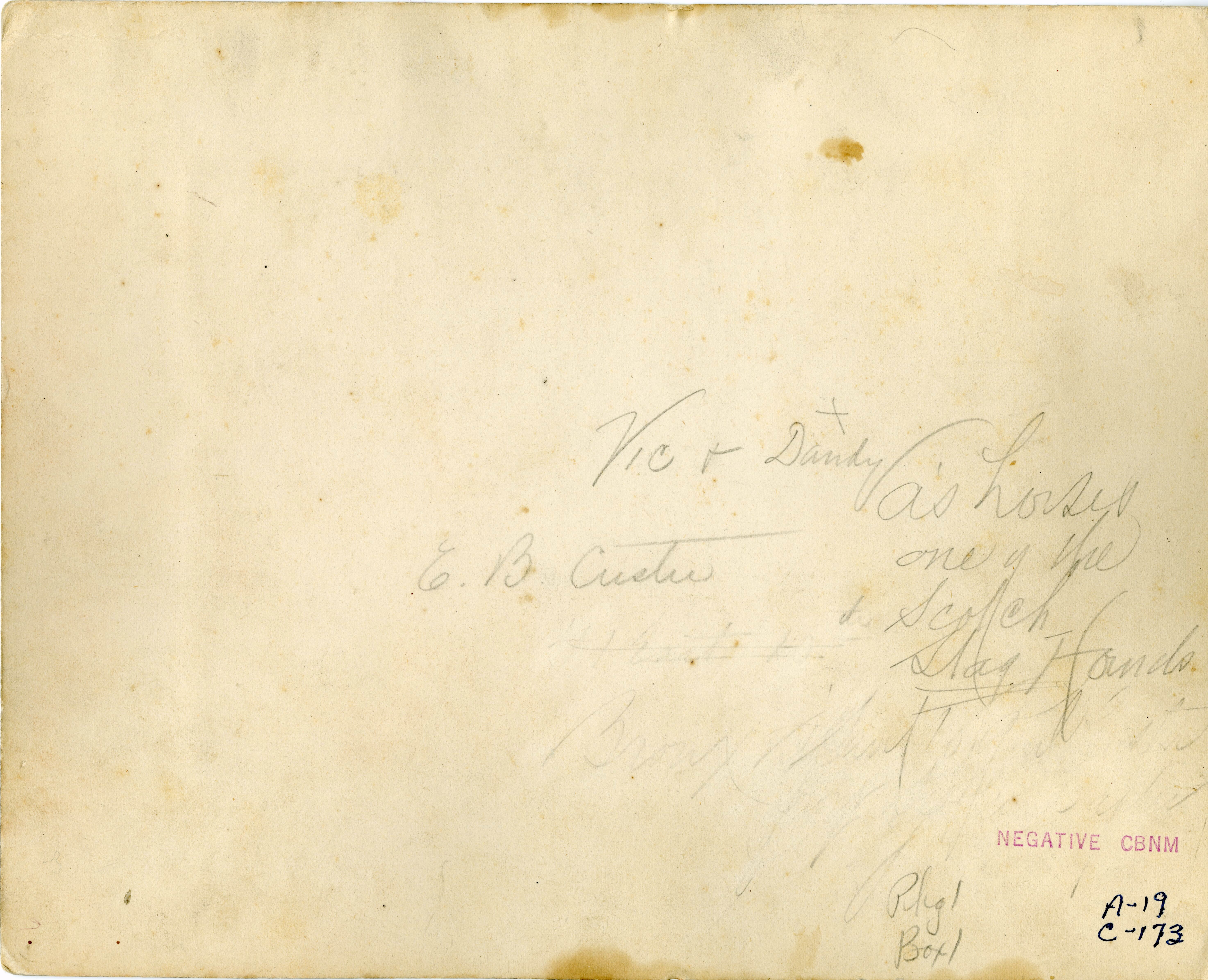 LIBI_00019_00173; This item is an albumen photograph of John Burkman holding the reins of Dandy and Vic, Custer's horses, with 4 Scotch Stag Hounds in the background. The full view photograph is 8" x 9 7/8" mounted and was produced circa 1875 by an unknown photographer. On the front below the image, a mostly illegible handwritten notation in pencil gives a description of Vic and Dandy On the verso, a handwritten notation in pencil reads, " Vic and Dandy/A's horses/one of the/Scotch/Stage Hounds/E.B. Custer." Note: "Pkg 1/Box 1" handwritten on the verso. Photograph reprinted in "The Custer Album" by Lawrence A. Frost, page 108.; PRINT, PHOTOGRAPHIC [Mounted on card]; Courtesy of the National Park Service, Little Bighorn Battlefield National Monument, LIBI_00019_00173, Unknown Photographer, "John Burkman with Dandy and Vic [George Armstrong Custer's Horses] and Four Hounds," circa 1875