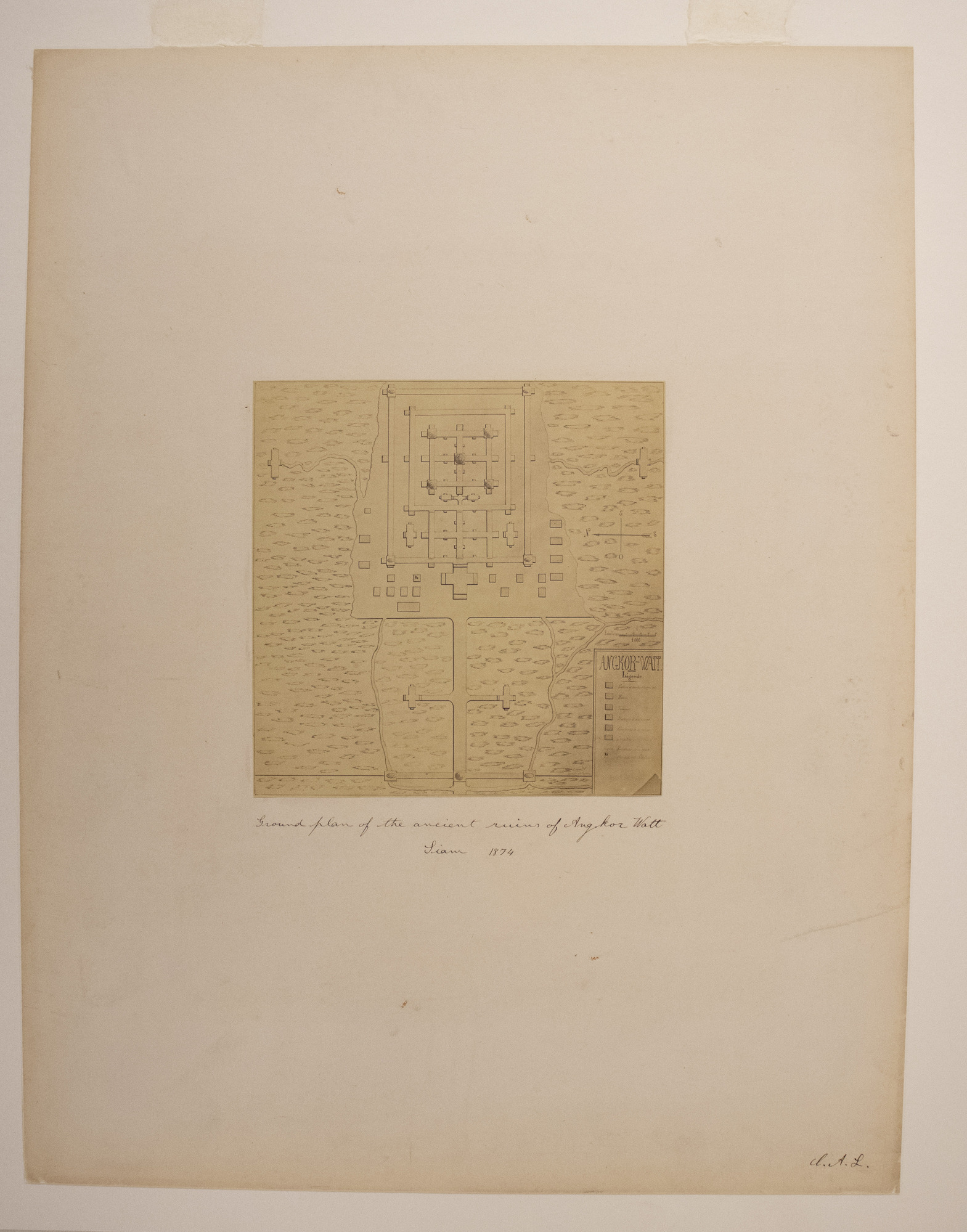 Diagram of Angkor Wat in Cambodia. Photo of ink sketch of ruins of temple complex. | Inscription: "Ground plan of the ancient ruins of Angkor Watt / Siam . . . 1874 / C.A.L." on front in ink in cursive by Charles Longfellow. | Dates and notes: 1874 as given in inscription.