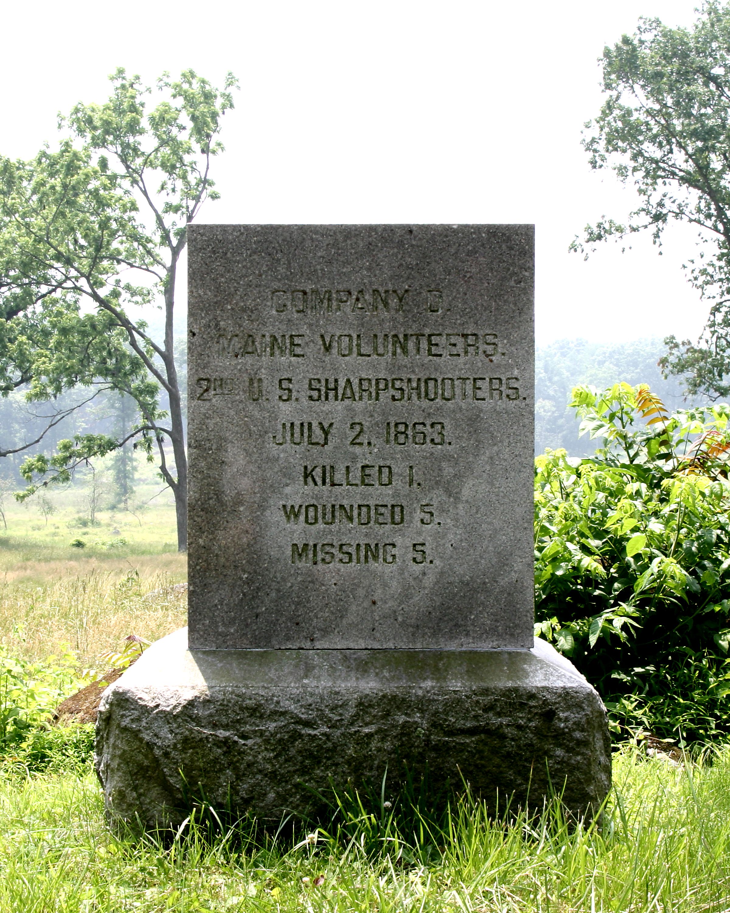 Marks generally the line held by the Maine Sharpshooters on July 2, 1863. The skirmish line reached from the Slyder farm to Rose Farm. 1 of 9 mns in Park to US Sharpshooters. || Smooth apex topped monolith, 2'6" square, 3'3" high, on rough hewn base, 3'4" square, 1'6" high. All 4'9" high. Inscription cut into N face.