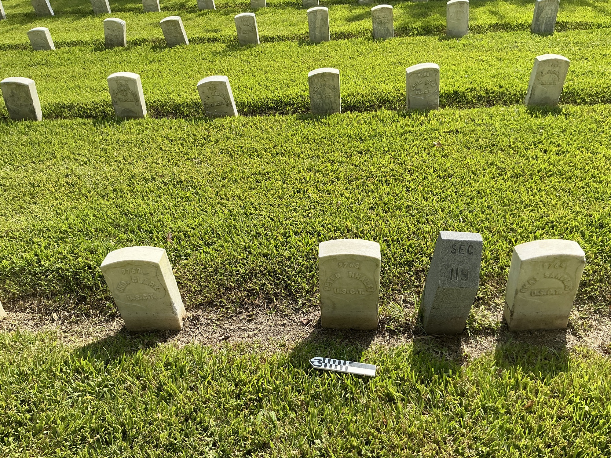 Headstone at Chalmette National Cemetery. Grave ID: 9763. Located at Section 119, Row 1, Site Number 8. Photo taken as part of the 2024 condition assessment and inventory.