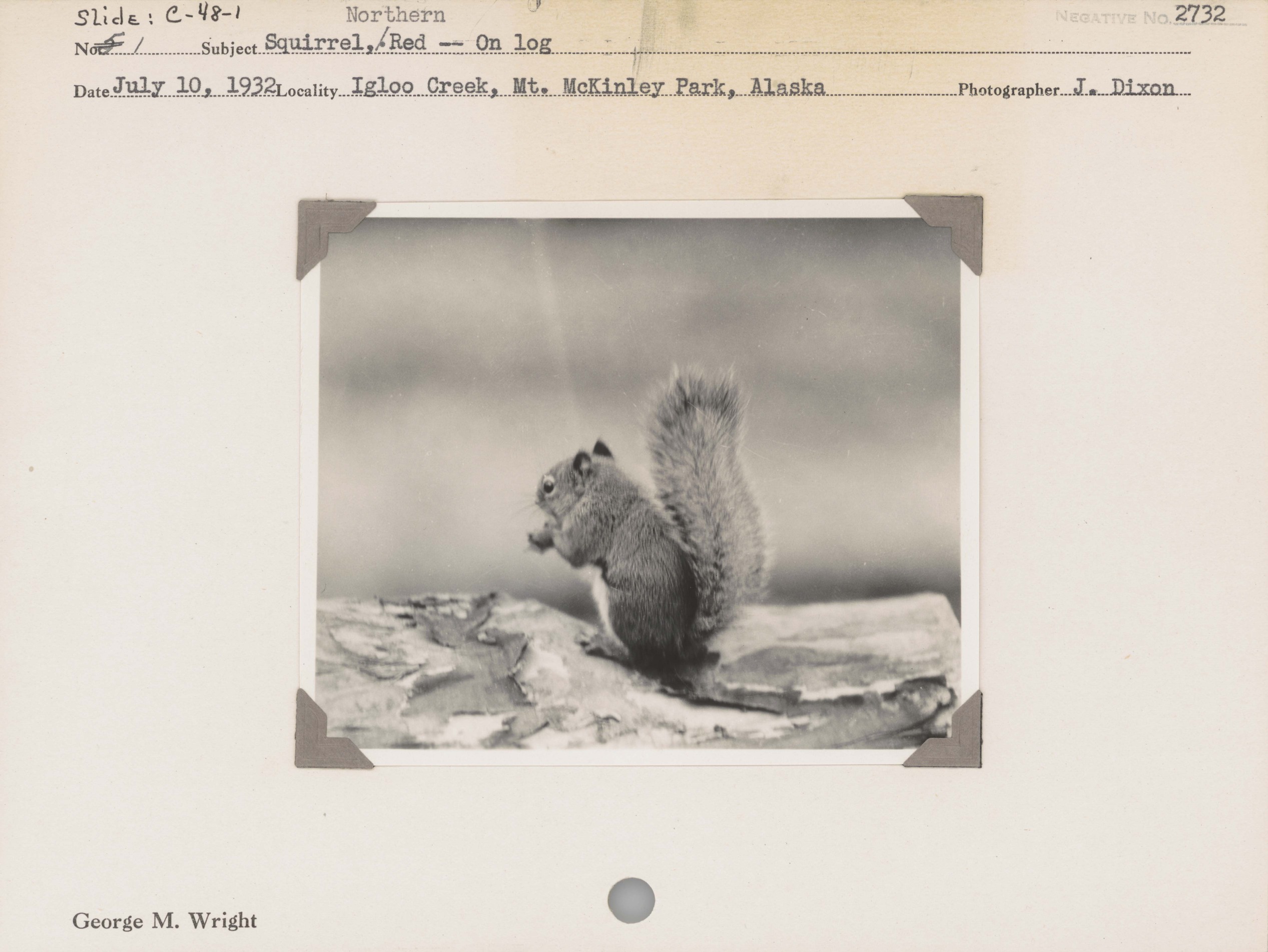 Squirrel, Northern Red--On log. Locality: Igloo Creek, Mount McKinley Park, Alaska [Denali National Park & Preserve]. Negative #: 2732