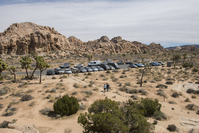 A small parking lot filled with vehicles surrounded by a desert landscape with some rocky formations in the background. Two people walk on a trail heading towards the parking lot.