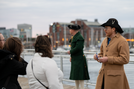 Two men in colonial era kit talking with event attendees. The harbor with boats are in the background.