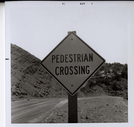 Sign reading 'Pedestrian Crossing' in Kolob Canyon. ; ZION Museum and Archives Image 007.01.01-31of73 ; ZION 15933