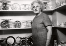 Wilhelmina Harris standing in front of shelves with various dishes and glassware.