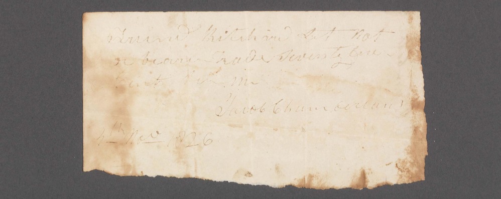 On front of document: "Friend Ritchard Let [illegible] or bearer Trade Seventy One Cents per Me Jacob Chamberlain 4th Nov 1826" On back of document: "J. Chamberlan"
