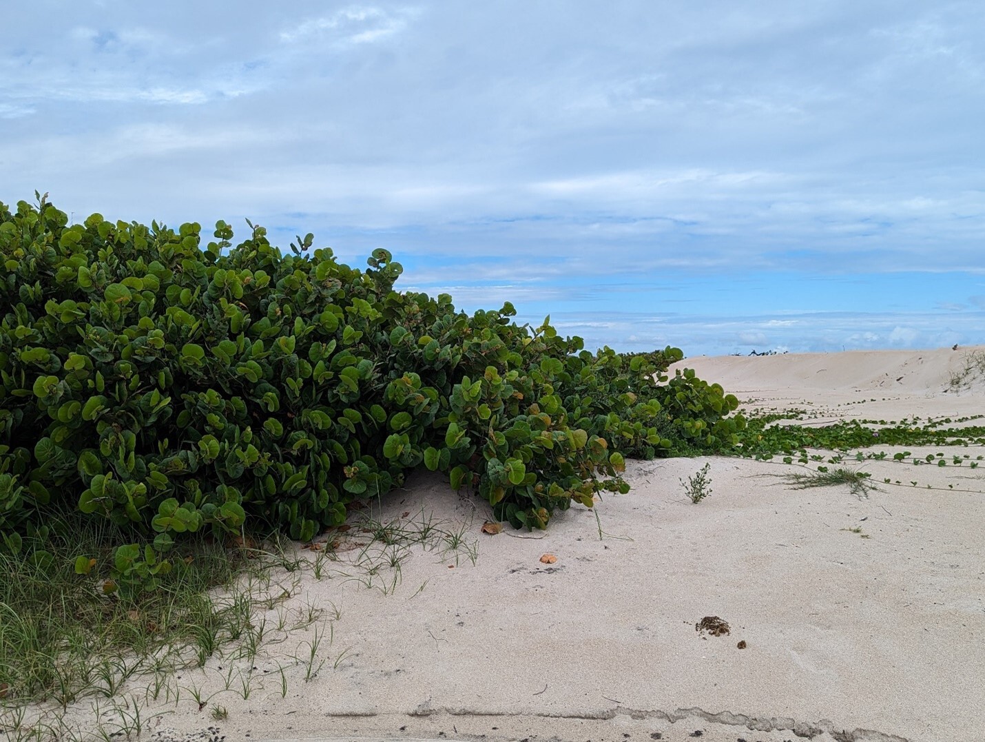 Playalinda sand dune vegetation on the left and sand on the right. Some cloud coverage in the skies.