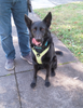 Dog sitting on the sidewalk with tongue out