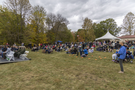 A green grassy field with several people in warm clothing and jackets stand and sit while listening to other people speak to them on a stage that is out of picture to the left. Some people in the crowd are seated in while chairs at the left side of the image.