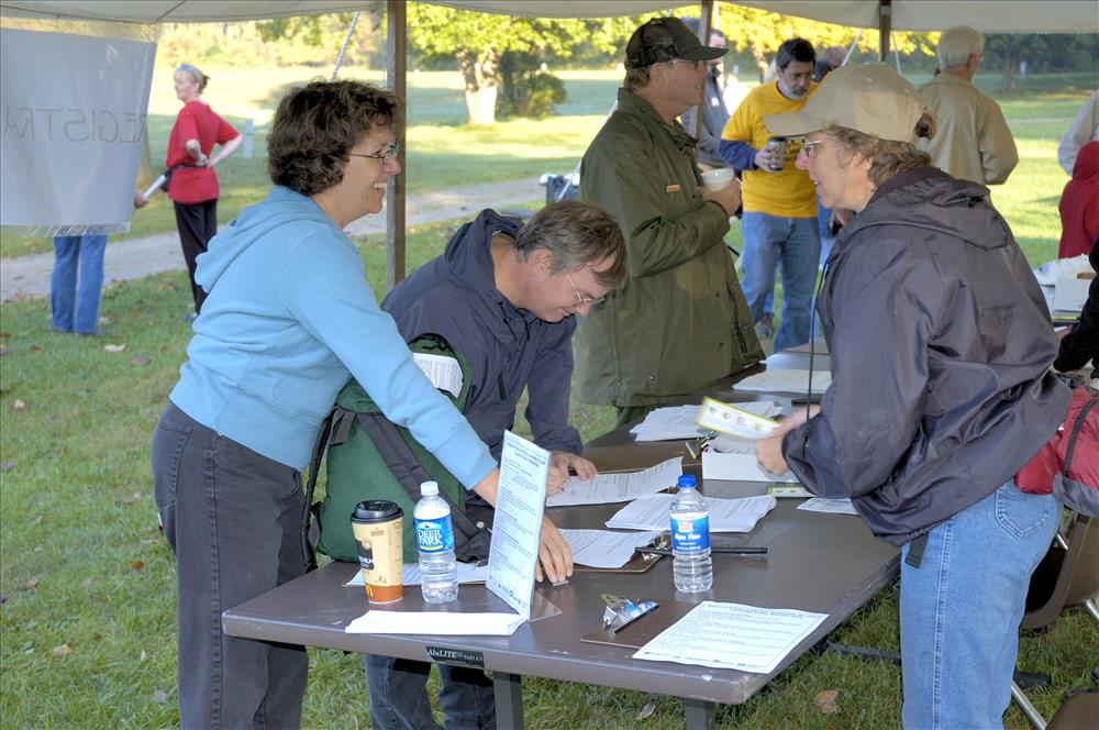 Volunteers register for National Public Lands Day 2007 at Howe Meadow. || The Adopt-a-Trail Program is an opportunity for people of all ages to assist the staff of Cuyahoga Valley National Park in maintaining safe and well-groomed trails by joining a group that takes responsibility for one trail. Volunteers help "sweep" the trail by picking up litter, trimming branches, clearing culverts, and reporting trail conditions. In 2007, over 110,000 volunteers across the country participated in the 14th annual National Public Lands Day, contributing over $12 million worth of labor in clean-up, trail repair, and planting.