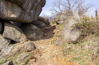 The camera is looking up a path along the slope of a small hill. The path is plain brown with its pavement recently removed. A massive boulder formation dominates the left portion of the frame. There are smaller boulders on the opposite end of the path.