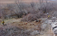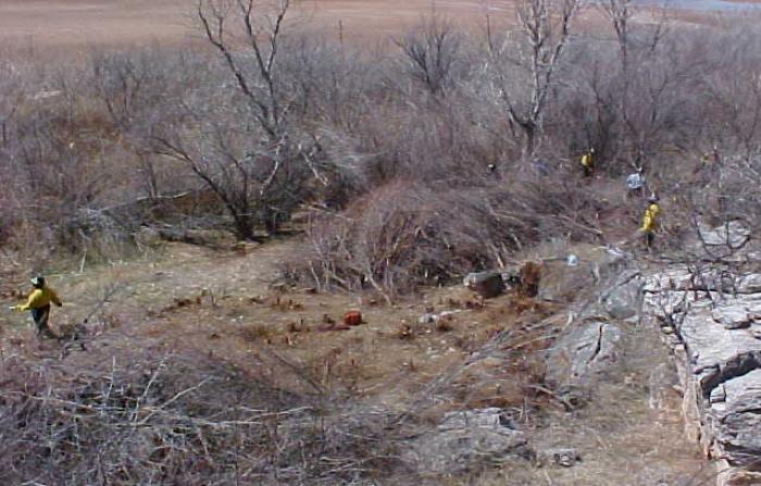 The Southern Plains Park Group was awarded funding through the Natural Resources Protection Program (NRPP) in FY 2000 to begin a long-term salt cedar eradication program. The primary goal was to remove approximately 6,000 acres of salt cedar around Lake Meredith NRA (LAMR) to improve water quality an quantity, allow native species to return, improve the threatened Arkansas River Shiner habitat by increasing stream flow, and provide for additional recreational usage and protection of visitor health and safety. Two primary objectives were to chemically treat and monitor salt cedar along streambeds, riverbanks, and the lake shoreline following the introduction of prescribed fire, and to perform chemical and mechanical treatments along streambeds, riverbanks, and the lake shoreline where salt cedar is not dominant. During FY00 to FY02 seasons, a 4-person Salt Cedar Reduction Crew treated a total of 832 acres of post-prescribed fire lands and 1,444 acres of mechanically treated lands, totaling 2,286 acres combined. Additionally, 1,500 acres of salt cedar is scheduled for burning and chemical treatment from FY03 to FY05.