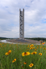 The Tower of Voices is in the center of grounds construction. A gentle rise of trees is in the distance and the green field in the foreground is dotted with small yellow wildflowers.