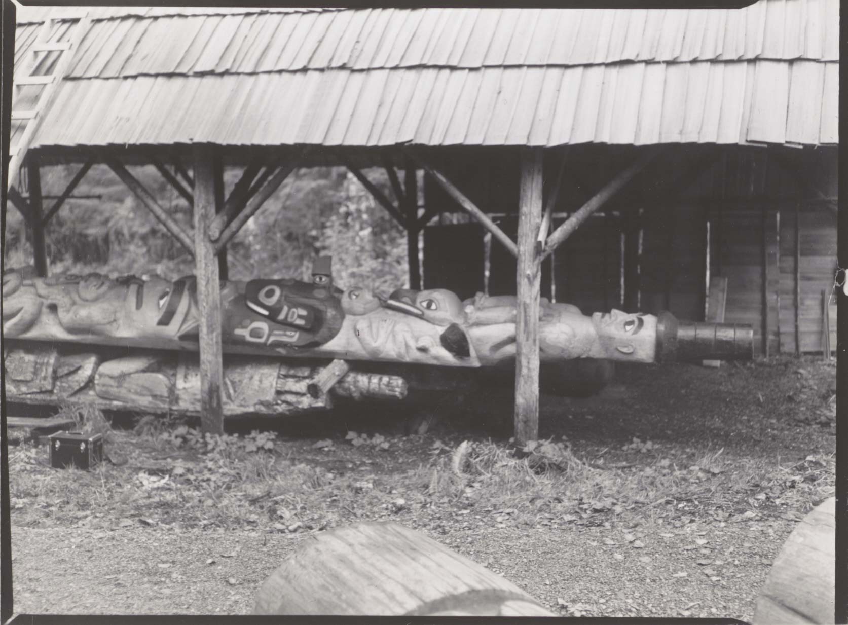 Upper portion of Spencer totem from Old Kasaan National Monument. Negative#: 10739. Location: New Kasaan, Alaska. Location of negative: Wildlife Division, Director’s Office. [This information comes from the reverse of the envelope for this negative number.].