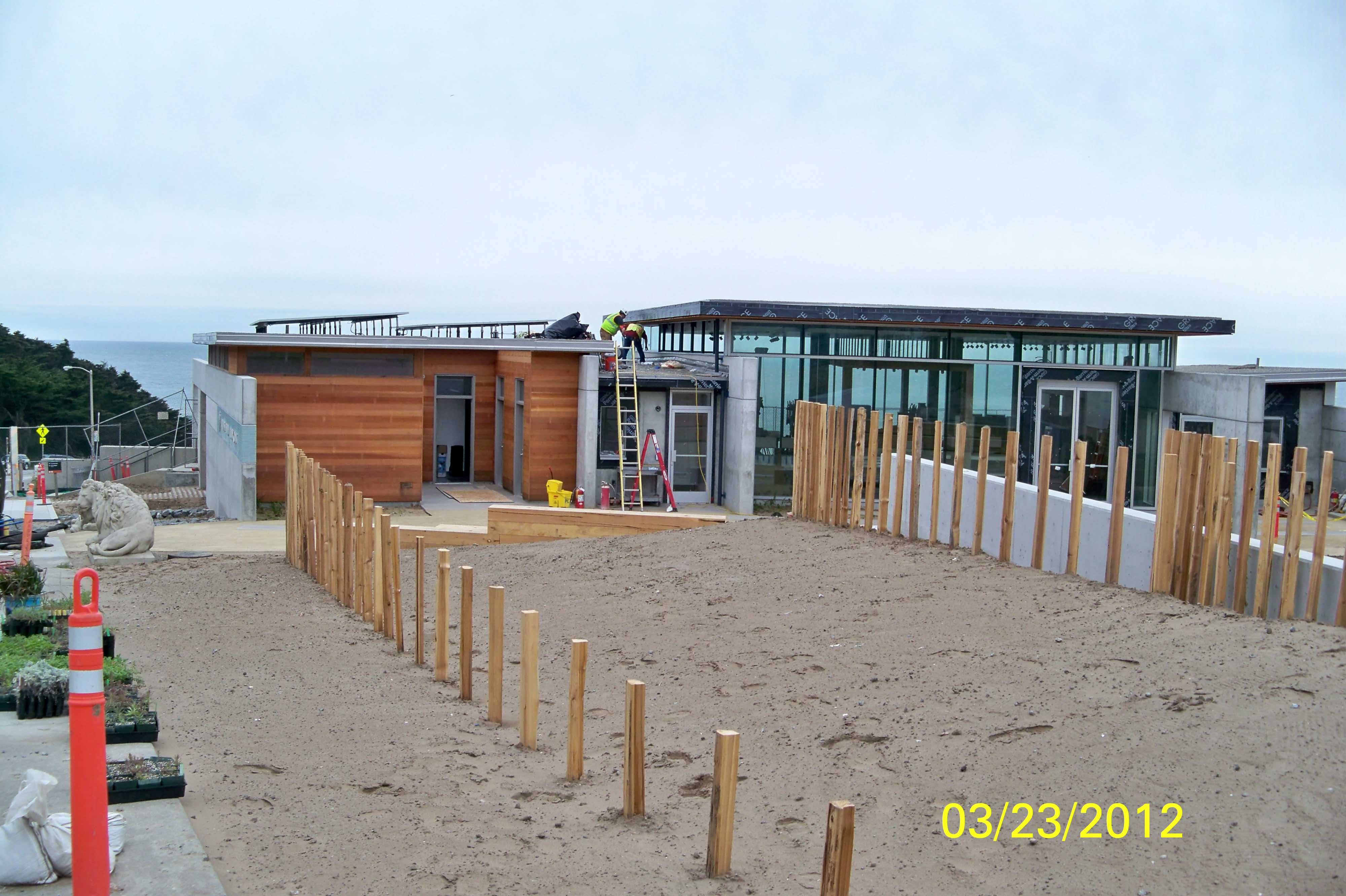 Group 2. Construction photographs for the Lands End Lookout visitor facility at Sutro Heights/Lands End, San Francisco, CA. Construction activities occurred August 2011-May 2012. The project constructed a new, 4100 sq. ft. visitor facility for the Sutro Heights district of Golden Gate National Recreation Area. Facilities include 2500 sf exhibits with integrated retail, 500 sf café, 1000 sf restroom, office for the park Site Stewardship program, and storage. Site improvements included volunteer installation of native plants grown through the parks nursery program, benches made from Monterrey Cypress harvested in the Presidio of San Francisco, and outdoor statuary which are replicas of statues originally located in the adjacent estate of Adolph Sutro, also part of Golden Gate NRA.