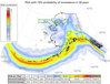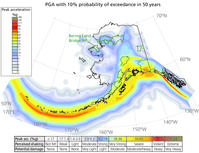 Map showing the probability of earthquakes in Alaska. Highest probability is along the island chain. Bering Land Bridge National Preserve has low to moderate probability.