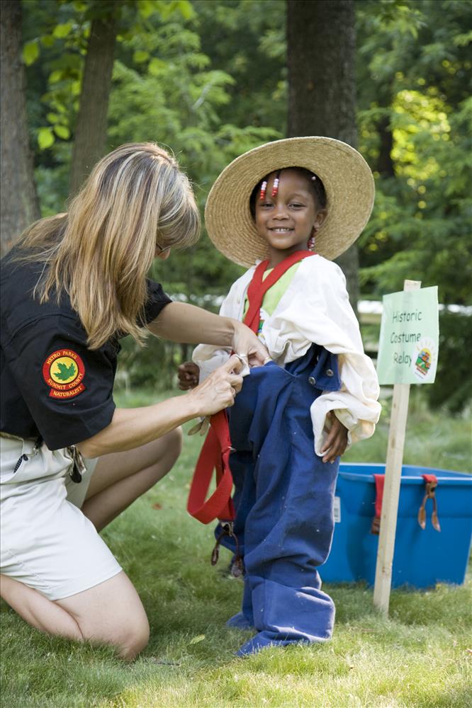 Cuyahoga Valley National Park (CVNP) and Cuyahoga Valley National Park Association present Get Up, Get Out & Go!, a campaign introducing recreational opportunities along the Ohio & Erie Canal Towpath Trail in Akron and the national park. The program targets residents in the urban neighborhoods surrounding the Towpath Trail in Akron which is a part of the larger Ohio & Erie Canalway, a national heritage area. Get Up, Get Out & Go! serves as an invitation for kids 11 to 14 years old and their families to give the Towpath Trail a try and to venture further along the trail into CVNP. || Youth do a historic costumes relay at the Get Up, Get Out, Go! kickoff event in June 2007.