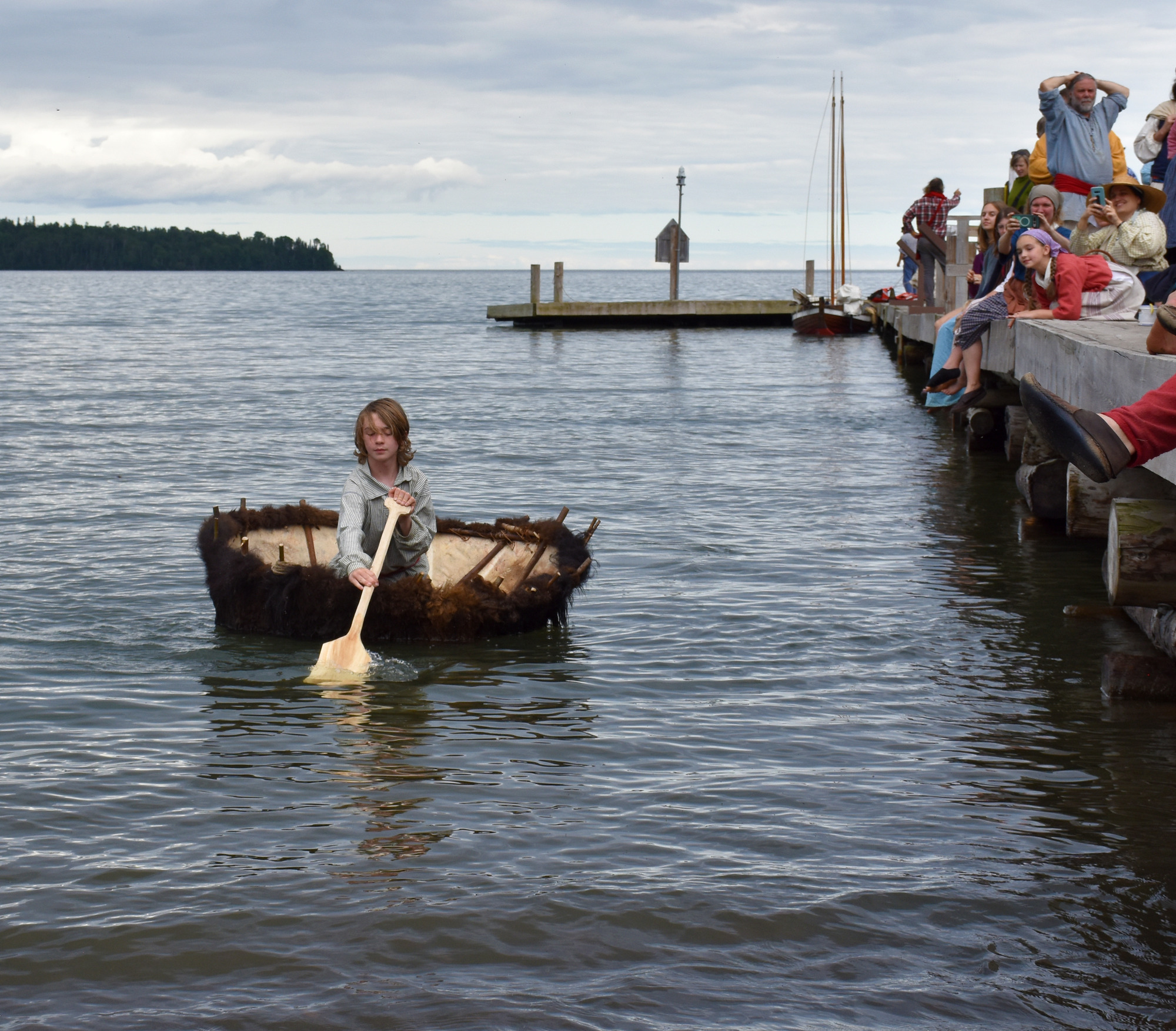 A young person paddles a bison hide bowl-shaped boat. A group of people watch from a dock.