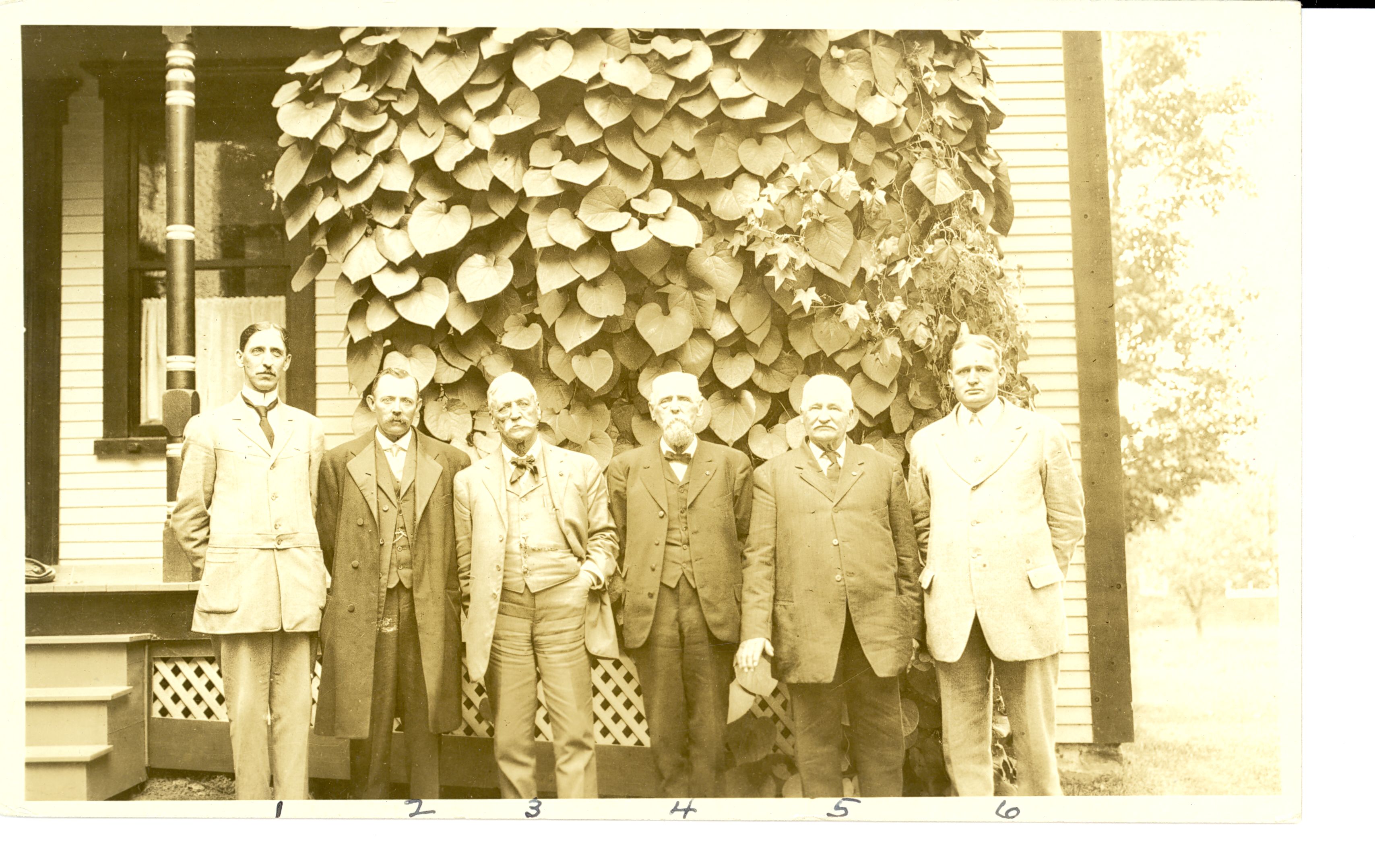 LIBI_00019_00265; This item is an original silver gelatin photographic postcard of Vermont Cavalry veterans of the Civil War standing in front of a building. The postcard is 3 3/8 x 5 3/8" and commissioned in circa 1913 by A. L. Cheney of Morrisville, Vermont. On the front bottom, numbers 1-6 are handwritten below the image of each of the subjects.On the verso, a handwritten notation reads: "1. Thos. C. Cheney/Speaker of the Vt. House of Representatives 1906-1910. Clerk of same 1894-1906/2. Harry Gould/Nephew of Maj. Gould. Member of Vt. House 1908-1910. Died Mar. 1916./3. Capt. Edward F. Griswold, Co. F, 11th Vt. Captured June 23/64 on [illegible word] R.R. near Petersburg. Confined in Libby Prison. Has given his pension for year to R.E. Lee [illegible word], Richmond, in aid of some poor confederate./4. Maj. Chas. G. Gould, Co. H, 5th Vt. First man of 6th Corps over the Confederate works at Petersburg Apr. 2/65. Had a bayonet driven into his mouth this side of his face and another one into his spin