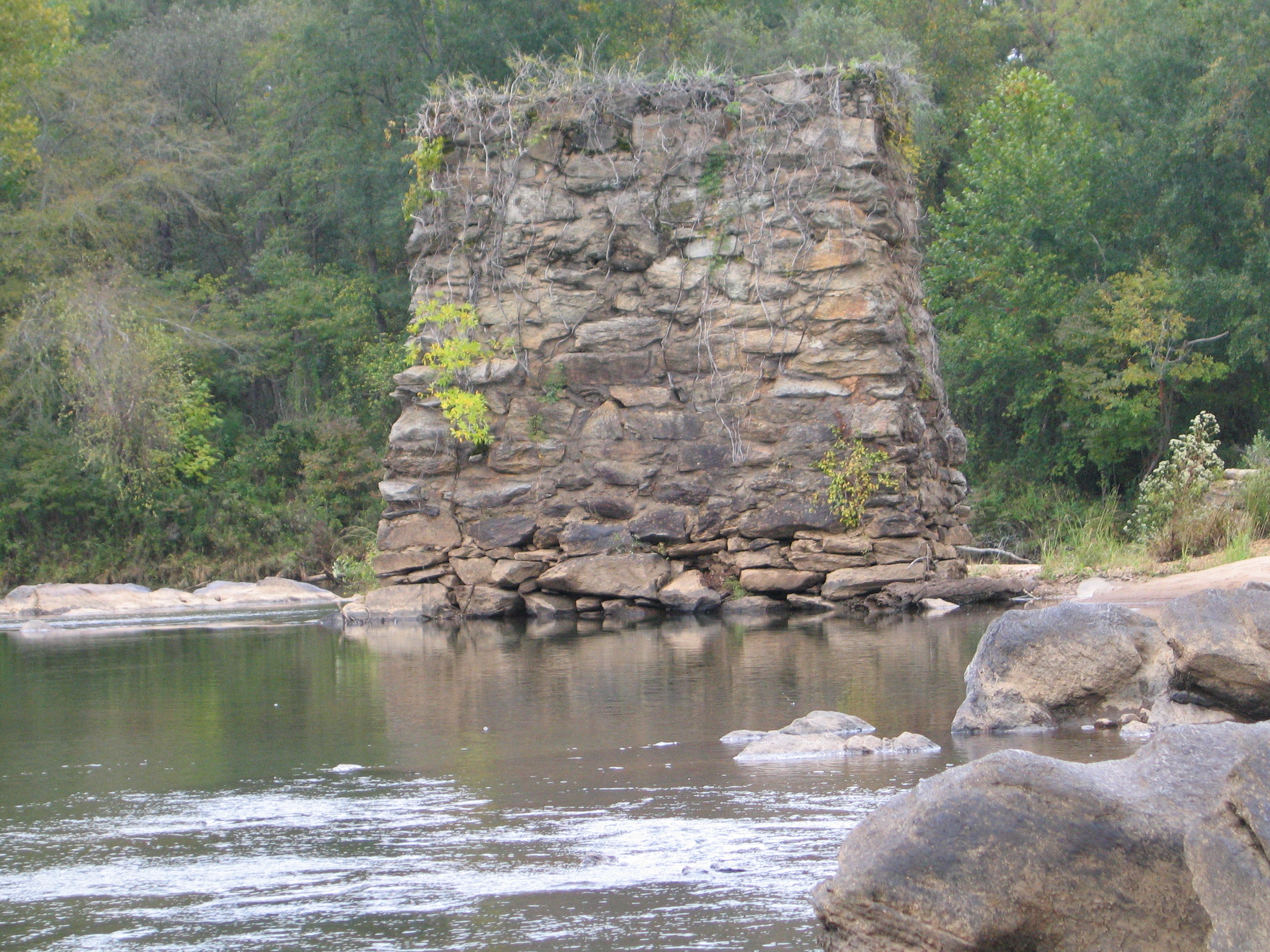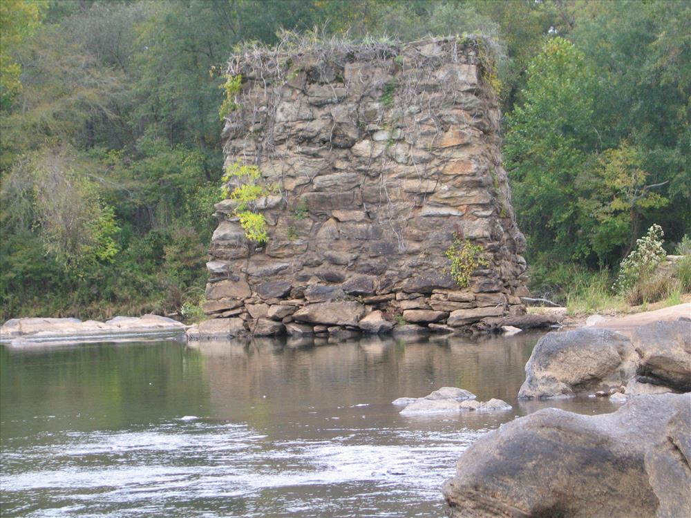The first fifteen of twenty-one images photographed to document the condition of the remains of Miller Covered Bridge. Park Staff, in a canoe, rowed out in the Tallapoosa to take the pictures of the pillars.