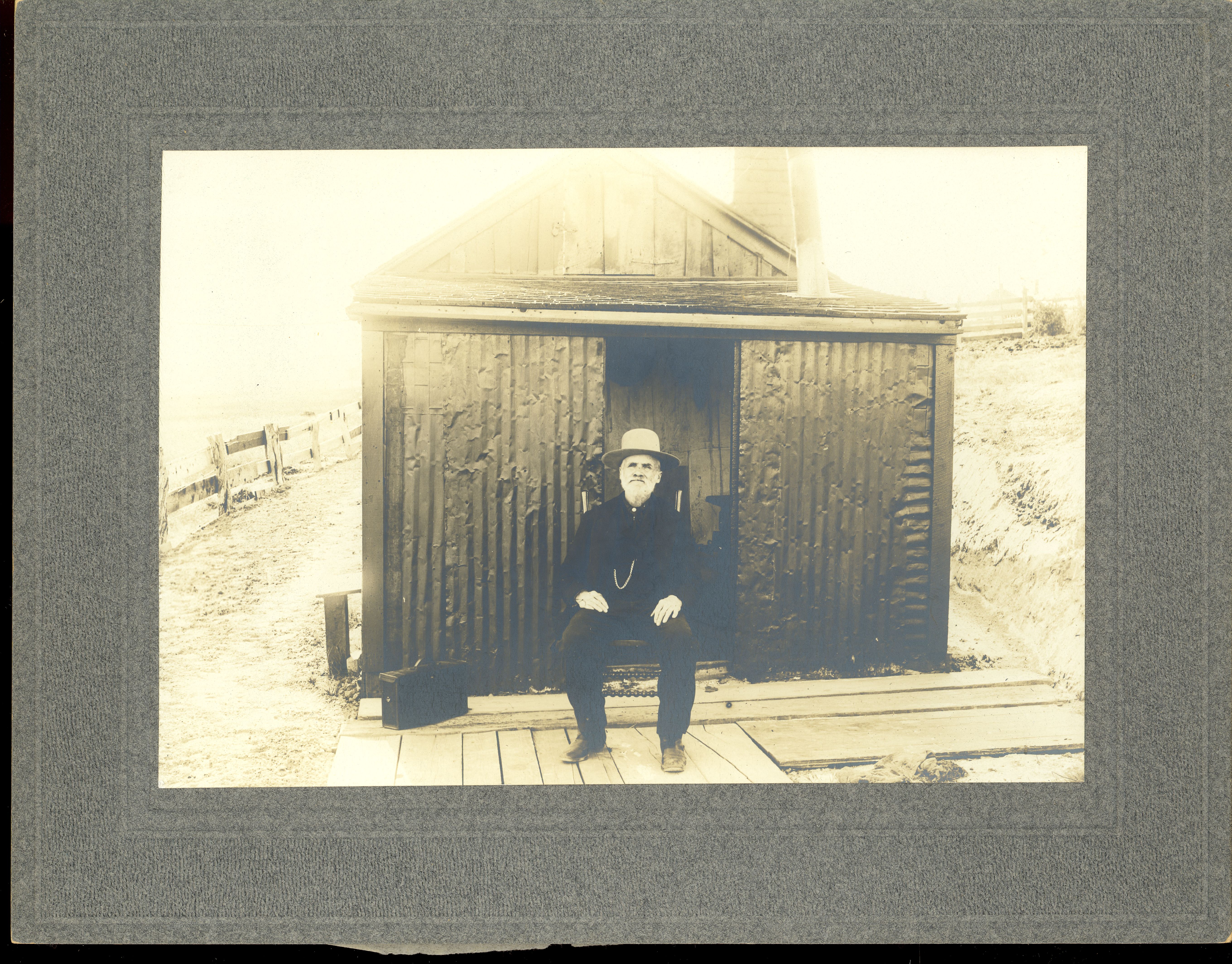 LIBI_00019_00177; This item is an albumen card-mounted photograph of John Burkman seated in front of his house. The full view photograph is 4 3/4 x 7" (7 x 9" mounted on a gray mount) and was produced circa 1923 by an unknown photographer. A typed note on tissue paper and glued to the top edges on the back of the mount reads, "Take me Mrs. Custer as I am. Your true servant John Burkman in my little home."; PRINT, PHOTOGRAPHIC [Mounted on card]; Courtesy of the National Park Service, Little Bighorn Battlefield National Monument, LIBI_00019_00177, Unknown Photographer, "John Burkman in Front of His House," circa 1923