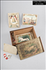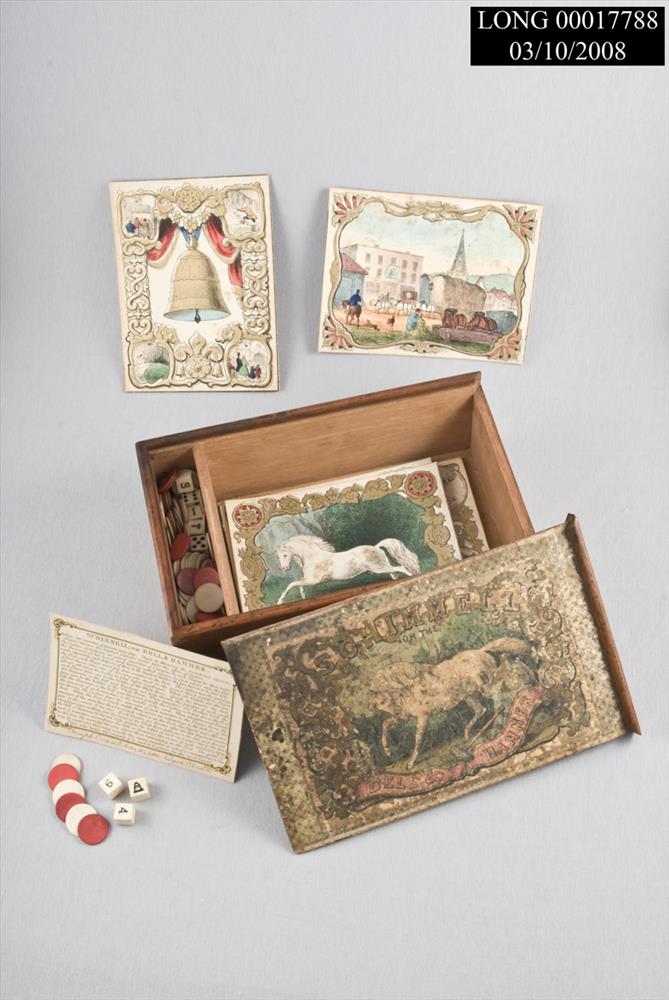 SCHIMMEL OR BELL & HAMMER. <CRA) BROWN WOOD BOX.<CRB) FLAT LID SLIDES OUT OF TOP OF BOX. TITLE, WHITE HORSE SURROUNDED BY TREES ON LID. <CRC) RULES CARD. <CRD) 5 CARDS: HAMMER, BELL, INN, WHITE HORSE, BOY & GIRL RINGING BELL. CARDS HAVE GILDED DECORATIONS. <CRE) 2 DICE. <CRF) 6 DICE, EACH W/5 BLANK SIDES & 1 OF: 6, 8, 1, 4, BELL, OR HAMMER. <CRG) GREEN, WHITE, RED COUNTERS. "No 9" AND "74/75" WRITTEN IN PENCIL ON BOTTOM OF BOX, "SCHIMMELL..." ON STICKER.
