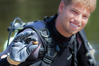 A diver holds up a rare mussel from a joint mussel survey conducted by the US Fish and Wildlife Service, Minnesota Department of Natural Resources, and National Park Service. The survey was held in Pool 2 below the Ford Dam.