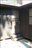looking southeast at rehabed exterior door and split log steps.