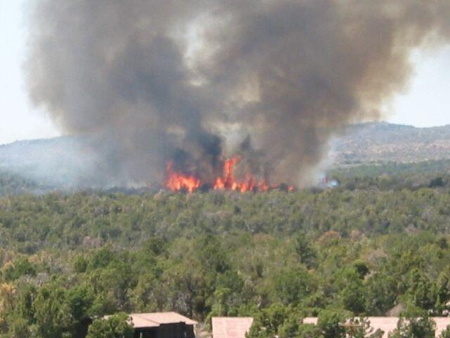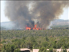 Full fire with black smoke advancing on buildings on the first day of Long Mesa Fire, Mesa Verde National Park, July 29, 2002