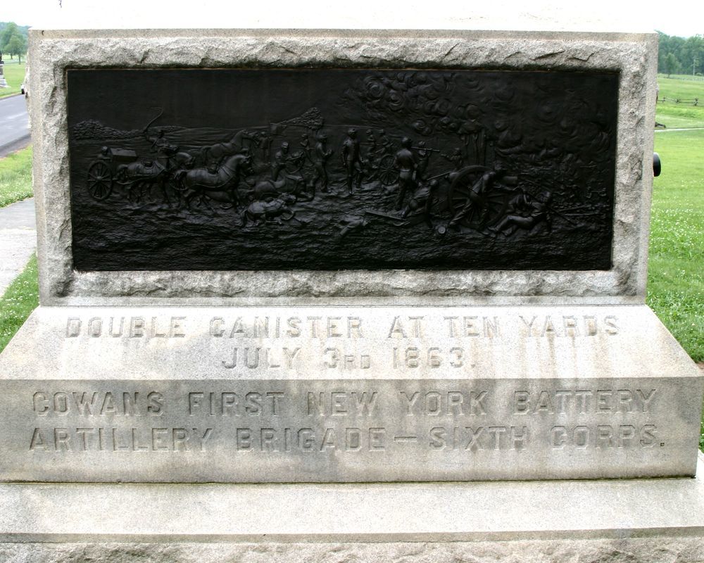 1 of 90 monuments to New York. Indicates position held July 3, 1863 by Cowan's 1st NY Independent Battery during Pickett's Charge. Located SE of Copse of Trees, W side of Hancock Ave. || Mn & 2 cannon. Base: 8'8"x5'6," steps to rough-hewn 2nd base. 2 part stepped shaft. 1st, finished stone w/ incised inscription. 2nd, rough-hewn w/ bronze medallion front, 6th Corps cross rear, Bas-relief & inscription on sides. All 7'2"H.