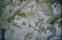 Mass of fossil bones in relief at quarry visitor center