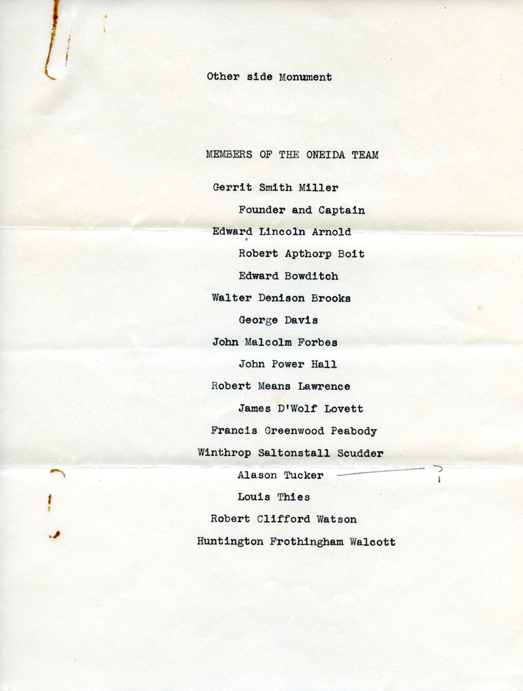 Draft document showing the inscription for the Oneida Football Club monument in the Boston Common. Document lists the members of the Oneida team. See following entries for related materials: "Document, Oneida Monument, nd p.1.tif", "Document, The Famous Oneidas, nd p.1.tif", and "Article, The Famous Oneidas.tif".