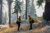 Wildland firefighters walking in wooded areas in and near the Blue Jay Fire. This area is near the Lukens Lake trailhead. The fire started on July 24, 2020 and was the result of a lightening strike. The park opted to confine and contain the fire. The people in photos are members of Yosemite's Wildland Fire Crew 1.