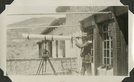 Mat Roy Thompson with telescope on Scotty's Castle Main House Gallery Porch, looking west. Circa 1930. Two hats on window sill, frame or gate leaning on wall and men's hats on window sill. Inscription in pencil, on reverse: 1. Black and white, 2 x 4 inch, horizontal format. Corner mounted in photograph album.