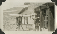 Mat Roy Thompson with telescope on Scotty's Castle Main House Gallery Porch, looking west. Circa 1930.