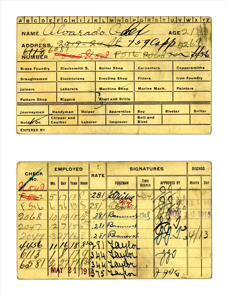 Early twentieth century employee card containing identifying information on the employee, and salary history, from Union Iron Works Co., which had been acquired by Bethlehem Steel Corporation.