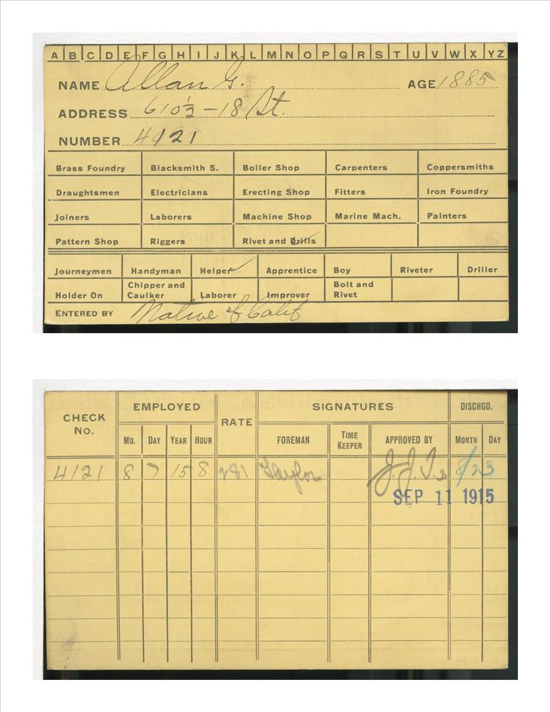 Early twentieth century employee card containing identifying information on the employee, and salary history, from Union Iron Works Co., which had been acquired by Bethlehem Steel Corporation.