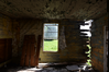 Wooden interior room with an open window and debris on the floor.