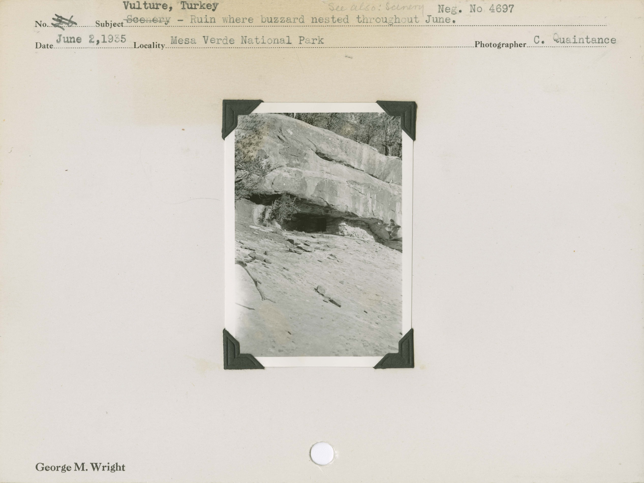 Vulture, Turkey- Ruin where buzzard nested throughout June. Locality: Mesa Verde National Park. Negative #: 4697